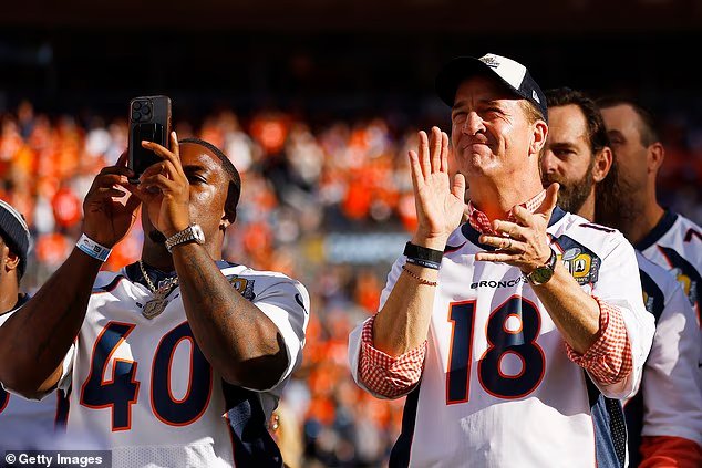 لاعبو دنفر برونكو السابقون جوان طومسون وبيتون مانينغ يصفقون خلال تقديم ديماريوس توماس بعد وفاته إلى حلقة مشاهير برونكو