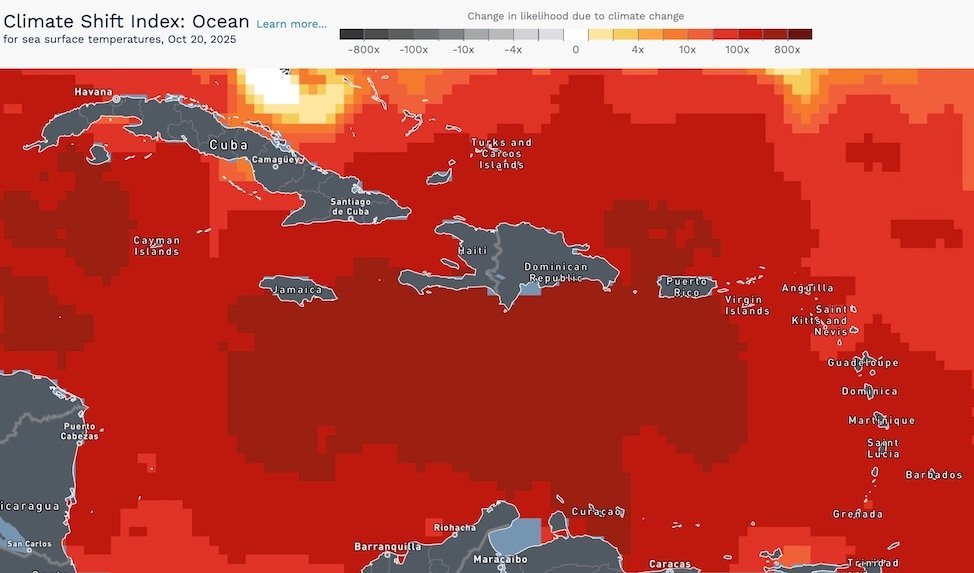 من صنع الإنسان تغير المناخ أدى ذلك إلى زيادة احتمال حدوث الدفء الحالي في منطقة البحر الكاريبي الوسطى بما يتراوح بين 500 إلى 800 مرة، وفقًا لمؤشر التحول المناخي الصادر عن مركز المناخ المركزي (انظر الشكل 2).