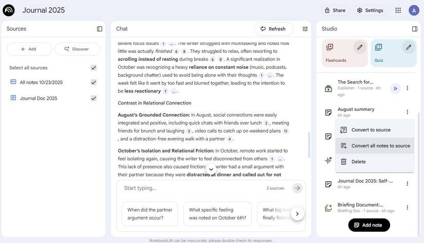 عندما أنهي مجموعة كبيرة من الأبحاث أو أتجاوز حد الخمسين مصدرًا، أذهب إلى استوديو علامة التبويب، انقر فوق أيقونة القائمة ثلاثية النقاط، وحدد تحويل كافة الملاحظات إلى المصدر.