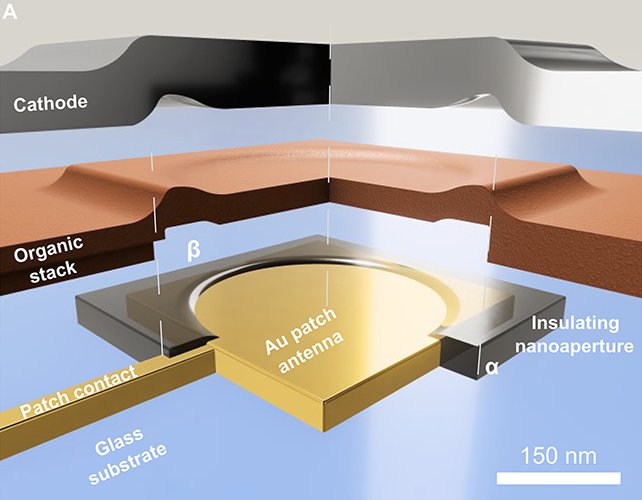 “بمساعدة اتصال معدني يسمح بحقن التيار في الصمام الثنائي العضوي الباعث للضوء مع تضخيم وإصدار الضوء المتولد في نفس الوقت، أنشأنا بكسل للضوء البرتقالي على مساحة تبلغ 300 × 300 نانومتر فقط.” يقول الفيزيائي التجريبي بيرت هيشت.