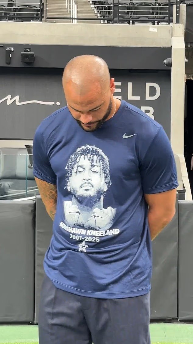 وفي أحد مقاطع الفيديو المنشورة على مواقع التواصل الاجتماعي قبل المباراة ، شوهد Cowboys QB Prescott وهو يصلي على الخطوط الجانبية بينما كان يرتدي قميص Kneeland.