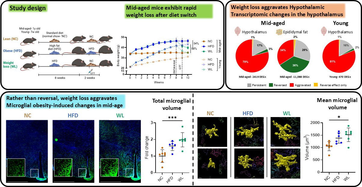 بحث بحث أجراه علماء في جامعة بن غوريون في النقب (BGU) مؤخرًا كيف أثرت السمنة الناجمة عن النظام الغذائي وفقدان الوزن لاحقًا على الشباب البالغين والفئران متوسطة العمر. استعادت كلا المجموعتين السيطرة الصحية على نسبة الجلوكوز في الدم خلال مرحلة فقدان الوزن، مما يشير إلى أن التحسينات الأيضية الرئيسية يمكن أن تحدث في أعمار مختلفة. ومع ذلك، في الفئران في منتصف العمر، أدت عملية فقدان الوزن بشكل غير متوقع إلى تفاقم الالتهاب في منطقة ما تحت المهاد، وهي منطقة في الدماغ تتحكم في الشهية وتوازن الطاقة والعديد من الوظائف الأساسية.