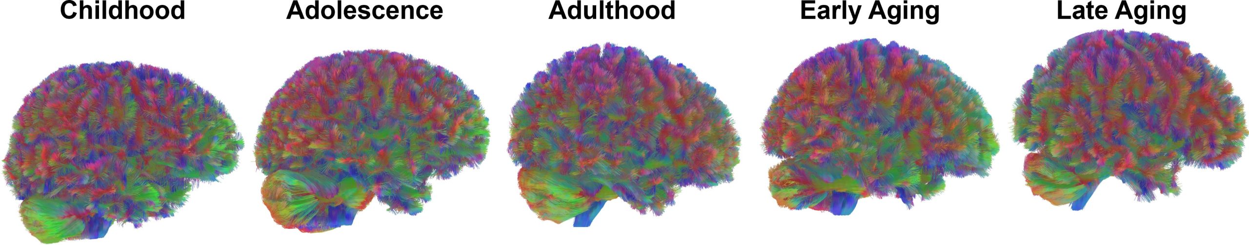 قام فريق بحث من وحدة علوم الإدراك والدماغ التابعة لـ MRC في كامبريدج بتحليل بيانات مسح انتشار التصوير بالرنين المغناطيسي من 3802 فردًا تتراوح أعمارهم بين حديثي الولادة إلى 90 عامًا. تتتبع عمليات المسح هذه حركة الماء عبر أنسجة المخ، مما يسمح للعلماء برسم خريطة للمسارات التي تربط المناطق المختلفة.