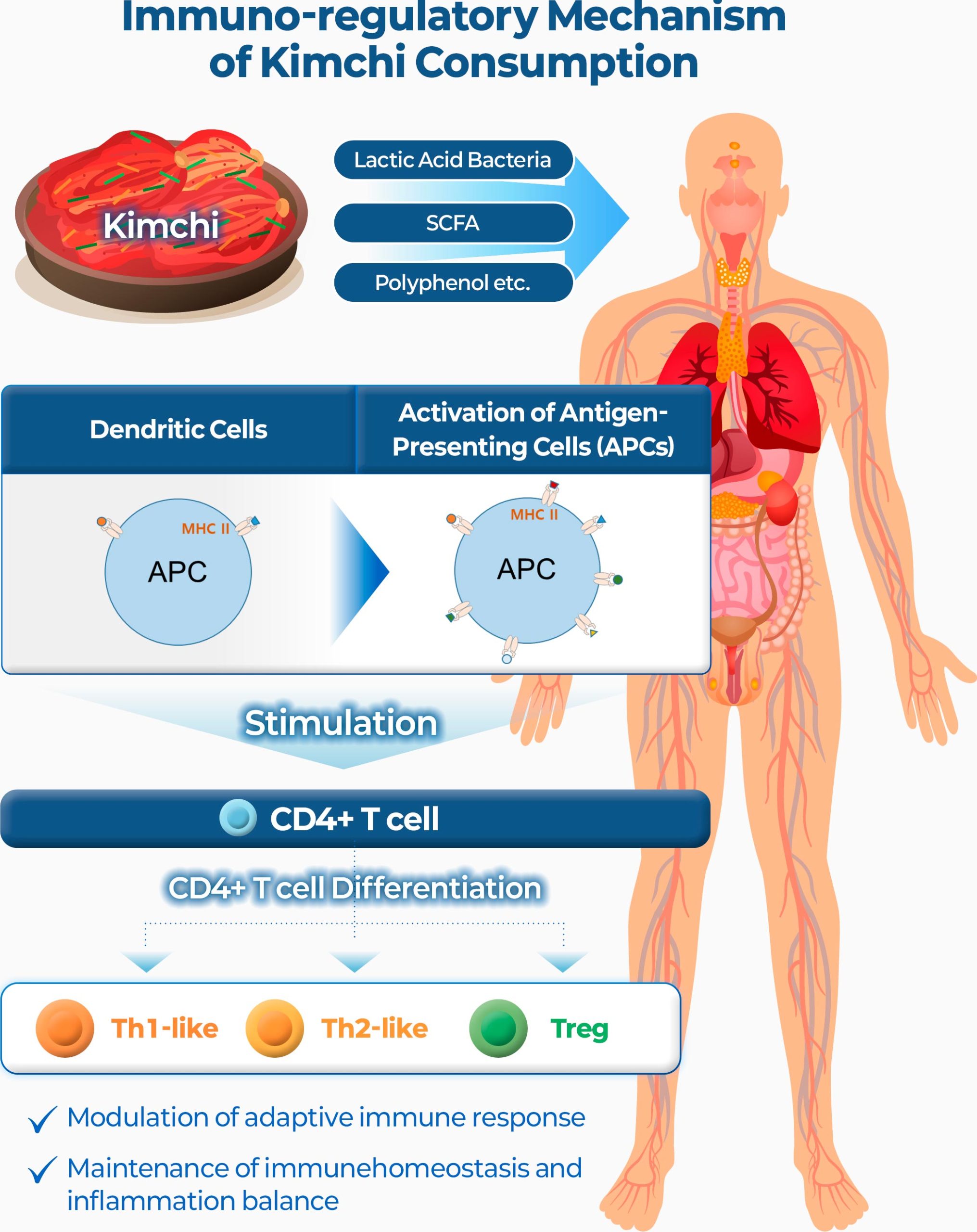 وأشار تحليل النتائج إلى أنه في المجموعات التي تستهلك الكيمتشي، تم تعزيز وظيفة الخلايا التي تقدم المستضد (APCs)، والتي تتعرف على الغزاة الخارجيين، مثل البكتيريا والفيروسات، وتنقل الإشارات. كما تمايزت خلايا CD4+ T إلى خلايا دفاعية وخلايا تنظيمية بطريقة متوازنة.