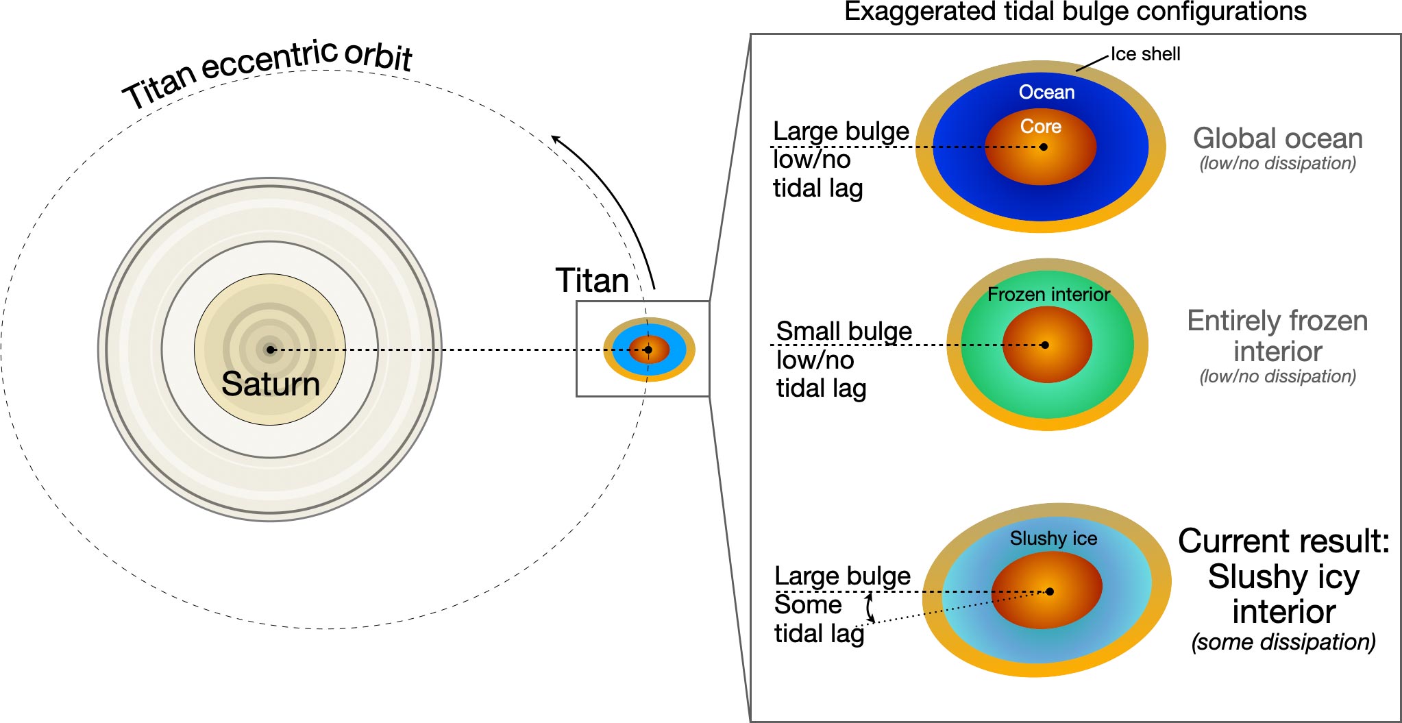 وبدلاً من المحيط المفتوح الممتد على الكوكب، يحتوي النموذج المفضل للفريق على كمية أكبر بكثير من الماء الطحلن ومياه أقل سيولة إلى حد كبير. المادة الذائبة سميكة بما يكفي لتحمل التأخر البالغ 15 ساعة، بينما لا تزال تحتفظ بالمياه التي تسمح لتيتان بالتشوه عندما تسحبها جاذبية زحل.